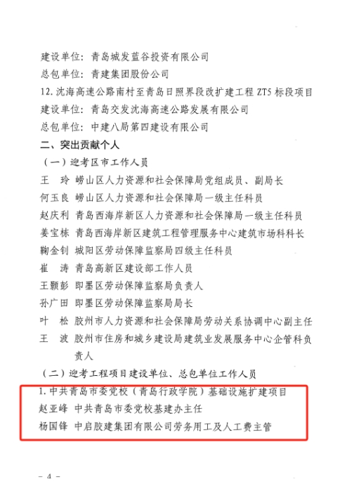 2024年,在公司領(lǐng)導(dǎo)的正確帶領(lǐng)下,在各單位各項(xiàng)目的大力支持和相關(guān)工作人員辛勤付出下,公司在保障農(nóng)民工工資支付工作方面先后圓滿完成了各項(xiàng)調(diào)研、檢查工作并取得了優(yōu)異成績。為表彰我公司在保障農(nóng)民工工資支付工作方面做出的突出貢獻(xiàn),青島市人社局、膠州市人社局分別向公司發(fā)來感謝信,對(duì)公司及在調(diào)研、檢查工作中做出突出貢獻(xiàn)的先進(jìn)項(xiàng)目和先進(jìn)個(gè)人魏翠英、楊國鋒進(jìn)行通報(bào)表揚(yáng)。